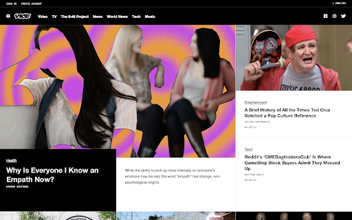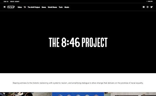 Developing from Vice magazine, originally based in Montreal, Vice Media Group LLC is an American-Canadian digital media and broadcasting company. Vice is my go to news magazine. They heavily rely on their photography and images to bring your attention to the articles. I appreciate any news outlet that cares about the artistic output of footage and photos, instead of only relying on the text of the article. Strong creative imagery is crucial to draw the eye in. Strong creative imagery is crucial to draw the eye into articles that may or may not be lengthy in information. I appreciate even the bad news if it is being designed and curated well like in Vice.